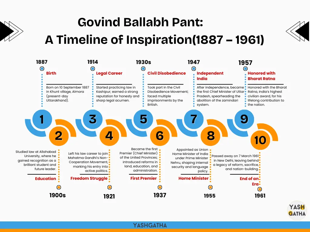 The true turning point in Govind Ballabh Pant’s life came when he chose to give up a flourishing career in law to dedicate himself entirely to India’s freedom struggle. His journey is best understood through a timeline of defining milestones: