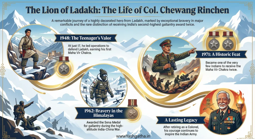 Colonel Chewang Rinchen, born in the remote Nubra Valley of Ladakh, rose from a humble Himalayan childhood to become one of India’s most decorated and respected soldiers, earning the rare distinction of receiving the Maha Vir Chakra twice for extraordinary bravery across multiple wars, and leaving behind a legacy that continues to inspire the Indian Army and millions of Indians with his unmatched courage, leadership, and lifelong service to the nation.