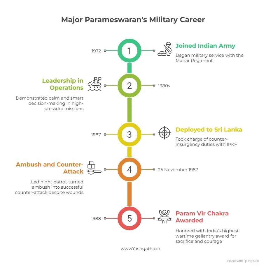 Major Ramaswamy Parameswaran was posthumously honored with the Param Vir Chakra in 1988, India’s highest wartime gallantry award, for displaying extraordinary courage, leadership, and presence of mind during a sudden ambush in Sri Lanka. The official citation praised his ability to stay calm under fire, reorganize his team in seconds, and lead a successful counter-attack even after being wounded. His bravery protected his men, turned the operation in India’s favor, and set an unforgettable example of duty beyond fear. His name is now permanently engraved among India’s greatest heroes, and the award stands as a symbol of his unmatched sacrifice and military excellence.