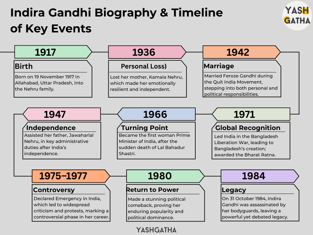 Indira Gandhi’s life was a blend of personal struggles, bold political moves, and defining moments that changed the course of Indian history. Here’s a timeline of her turning points from birth to death: