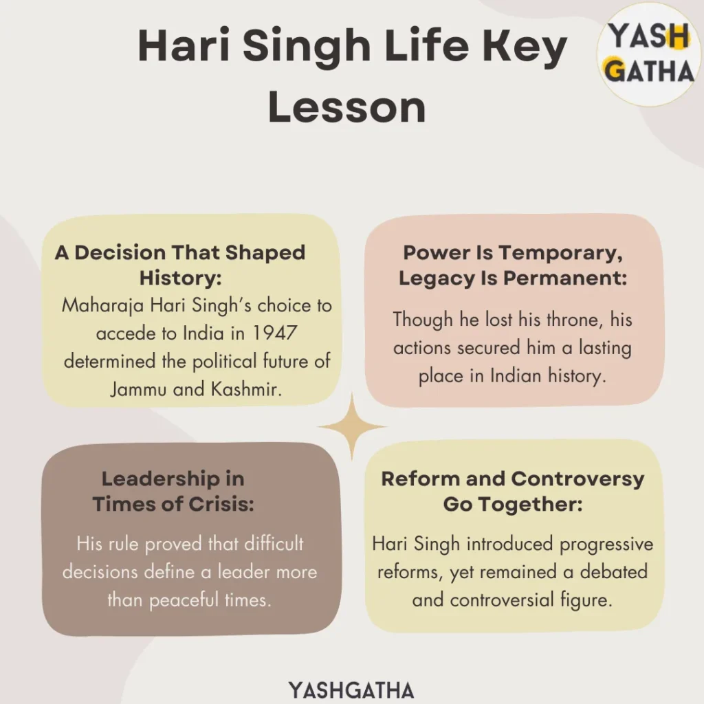 This single decision became the defining moment of his life. By signing the Instrument of Accession, Maharaja Hari Singh legally integrated Jammu and Kashmir with the Dominion of India during one of the most critical crises of Partition. This act earned him a permanent place in Indian history.