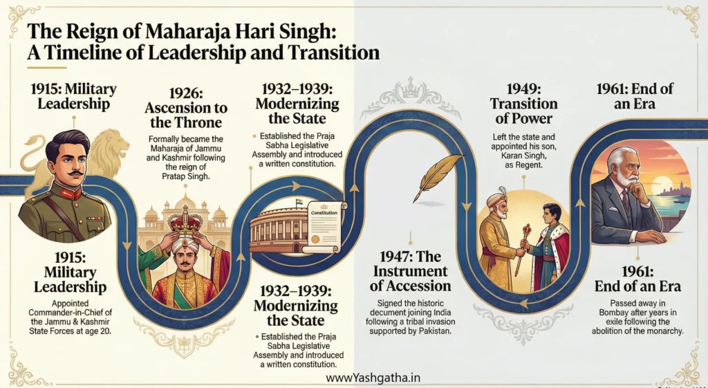 Maharaja Sir Hari Singh Bahadur (1895–1961) was the last ruling Maharaja of Jammu and Kashmir, best known for signing the Instrument of Accession in 1947 that integrated the princely state with independent India. Maharaja Hari Singh was the last ruling monarch of Jammu and Kashmir and one of the most important figures in modern Indian history. In 1947, at a time of political chaos and invasion, his single decision to sign the Instrument of Accession changed the destiny of an entire region. Admired by some and criticized by others, his life remains a powerful story of power, politics, controversy, and legacy.