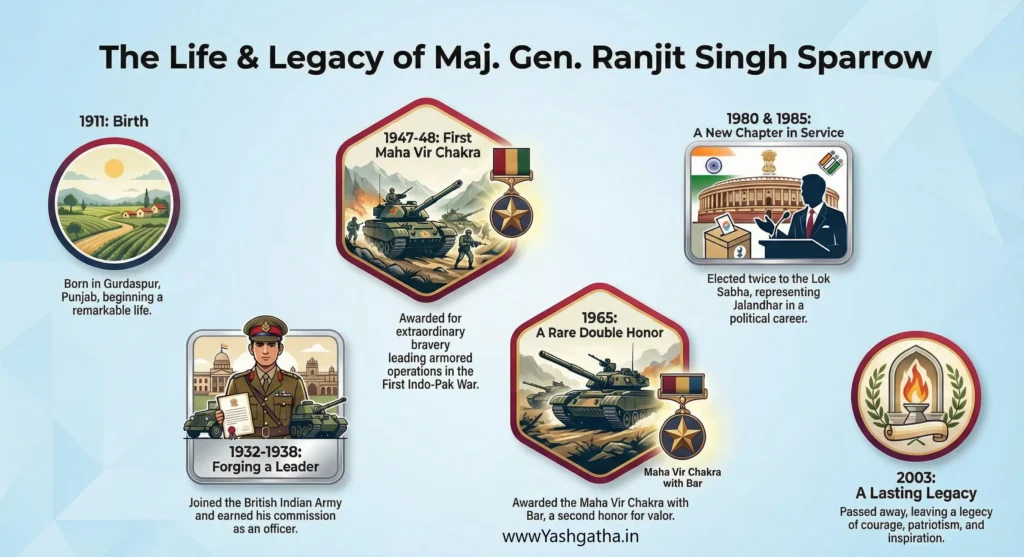 Major General Rajinder Singh “Sparrow,” a legendary Indian Army hero from Gurdaspur, Punjab, was twice awarded the Maha Vir Chakra for his extraordinary bravery in the Indo-Pak wars and is remembered as a fearless leader and true patriot. Major General Rajinder Singh “Sparrow” is one of India’s most fearless war heroes, honored twice with the Maha Vir Chakra for unmatched bravery. From leading armored divisions in the Indo-Pak wars to inspiring generations with his courage, Sparrow’s life is a tale of grit, strategy, and unwavering patriotism. Known for saying, “Not Eagle — I am just a Sparrow,” his story proves that true heroes are forged in the fiercest battles.